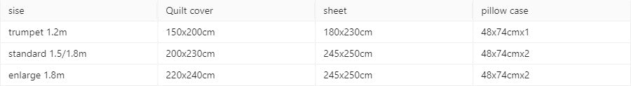 Size specifications: 1.2m three-piece set (quilt cover 150*200),1.5m four-piece set (quilt cover 200*230),1.8m standard four-piece set (quilt cover 200*230),1.8m plus-sized four-piece set (quilt cover 220*240)